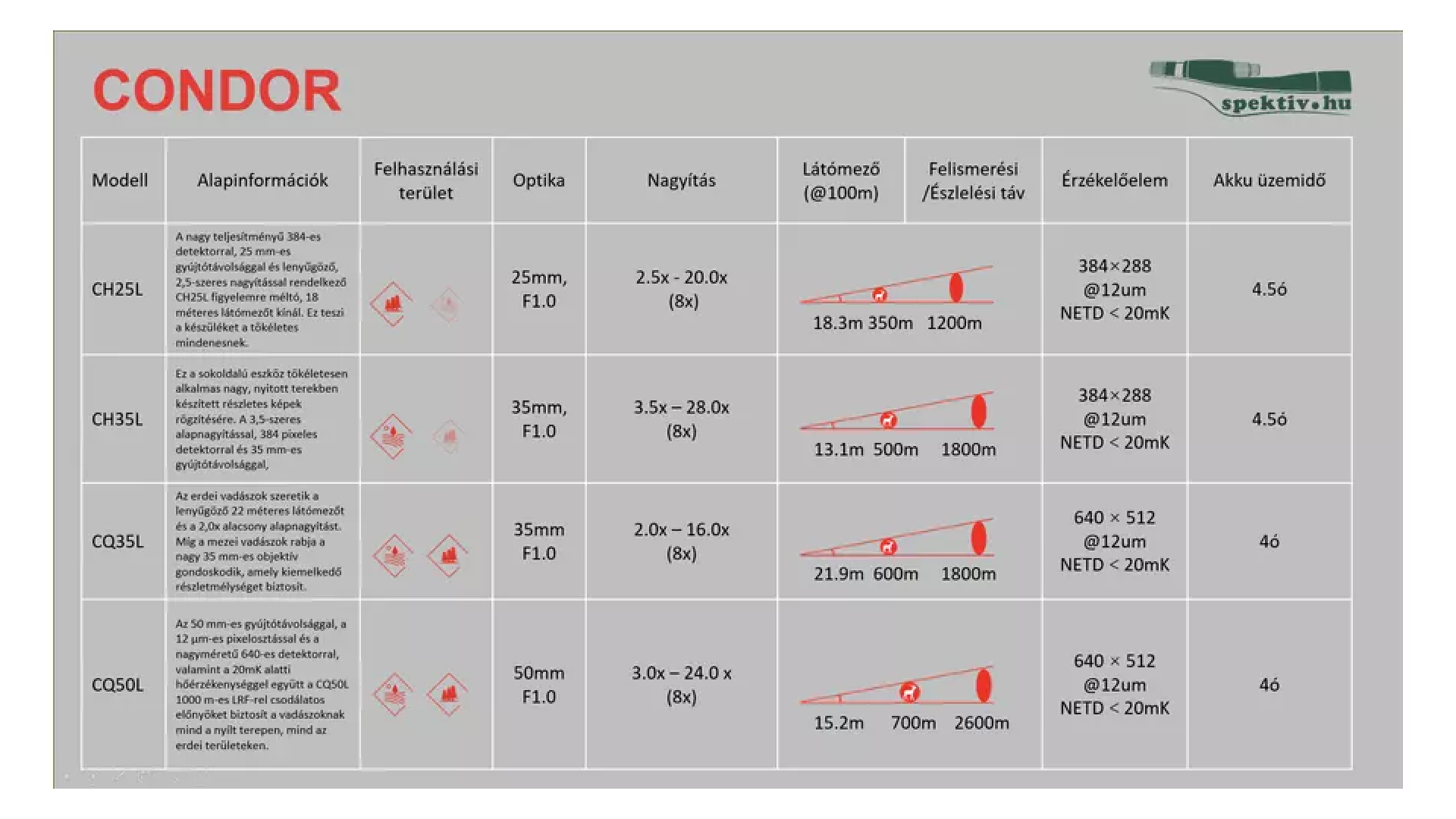 A Hikmicro legújabb kézi hőkamerája a CONDOR CQ50L beépített, 1000 m-es hatótávolságú lézeres távolságmérővel és cserélhető akkumulátorral. Az új kamerában 12 mikronos érzékelő van, nagyérzékenységű 20mK-es termikus érzékelővel nagy felbontással 640x512 pixel, 50 mm-es optikával szerelve. Az észlelési távolság kb.2600 méter, a látószöge pedig 8,7 fok. A tökéletes képi élményt az Image Pro és Zoom Pro képjavítási eljárások használatával fokozhatjuk. A készülék optikai alapnagyítása 3x-os - digitális zoom használatával elérhető a 24x-os nagyítás.
